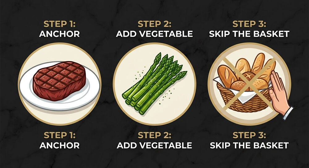 Step 3: Skip the bread basket. Not because bread is the enemy. Because it's 300-400 extra calories that you didn't decide on, you just ate because it was there. That one move alone changes the trajectory of the meal. Push it to the other side of the table or ask the server not to bring it.