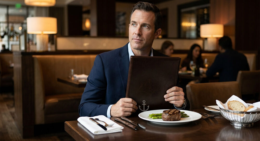 The rule is this: decide your protein anchor before you look at the menu. Every meal, every restaurant, every city. Before the bread basket, before the specials, before anyone suggests splitting the appetizer, you've already decided: steak, salmon, chicken, or shrimp.